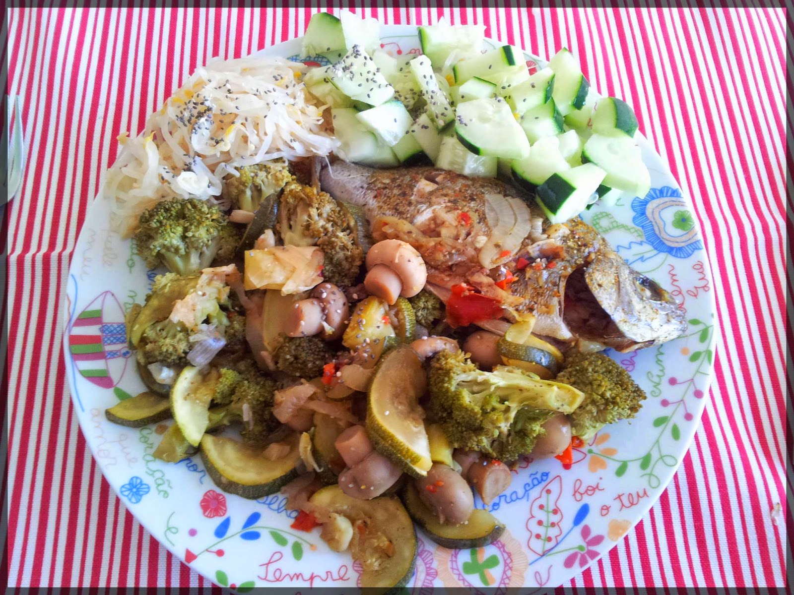 Jantar: pepino, rebentos de feijão mungo + legumes no forno + dourada no forno sem gordura + maçã