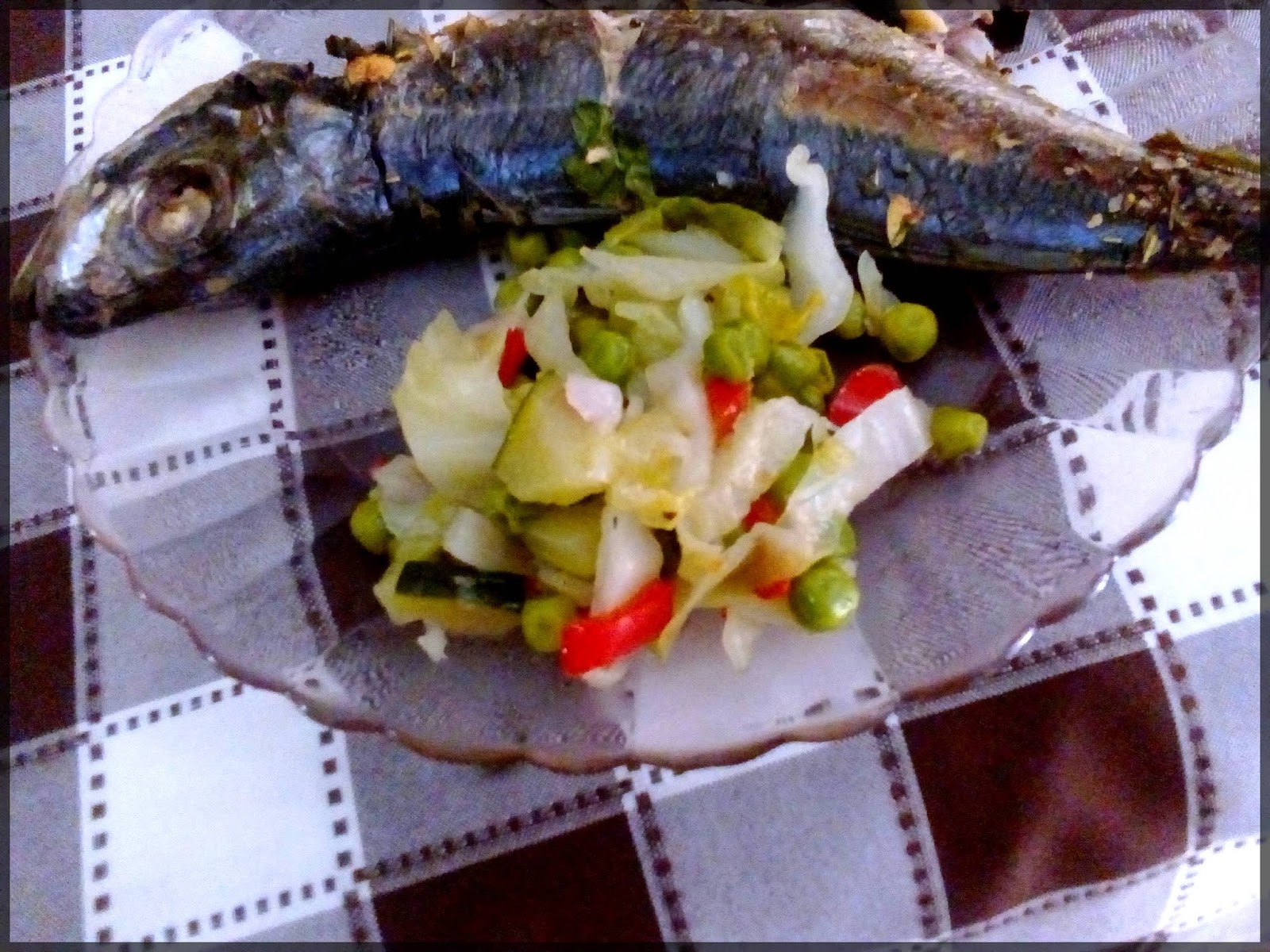 Almoço: carapau cozido + ovo sem gordura e cogumelos + salada
