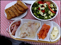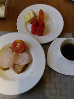 A primeira parte do pequeno almoço no Dubai. Acabei por não comer a fatia de pão torrado porque o pão árabe encheu-me as meidas. Acompanhei com fiambre de aves, queijo fresco, salsicha de aves, papa de aveia e chá